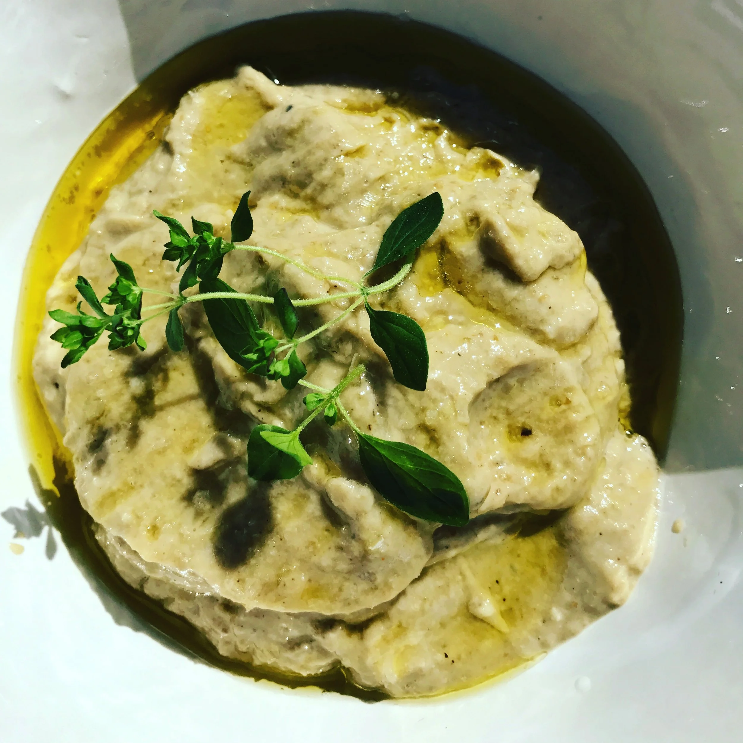 Röra på aubergine, tahini, vitlök, spiskummin. Gott till lamm med eller farish kebab på nöt- eller lammfärs med mellanöster kryddor.