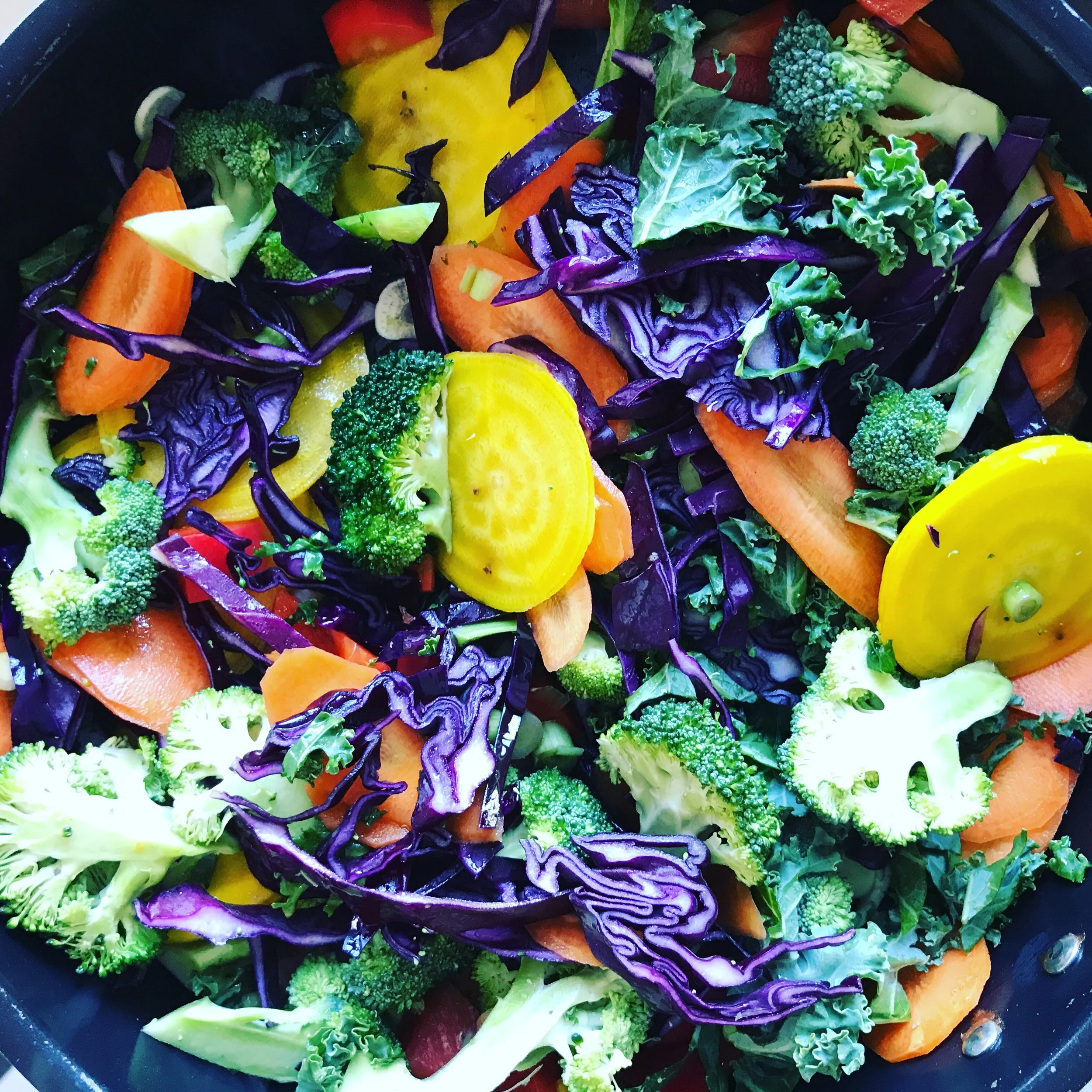 Då och då gör jag en kylskåpsrensning och då blir det ofta en sådan här variant. Jag skär helt enkelt upp vad jag har, bestämmer vilken kryddning jag vill använda. Tex lite medelhav med rosmarin, timjan, oliver och olivolja eller asiatiskt med ingefära, vitlök, ett par matskedar av risvinäger, soja och sesamolja. Exempel på grönsaker jag gärna använder i det här är: